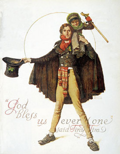 Tiny Tim is a fictional character in the classic story. He is the son of Bob Cratchit. It is claimed that the character is based on the invalid son of a friend of Dickens who owned a cotton mill in Ardwick, Manchester. Source. When Scrooge is visited by The Ghost of Christmas Present he is shown just how ill Tim really is, and that Tim will die unless he receives treatment. When visited by The Ghost of Christmas Yet to Come all he sees of Tim is his crutch because Tim has died. This, and several other visions, lead Scrooge to reform his ways.In the story, Tiny Tim is known for the statement, "God bless us, every one!," which he offers as a blessing at Christmas dinner. Dickens repeats the phrase at the end of the story.